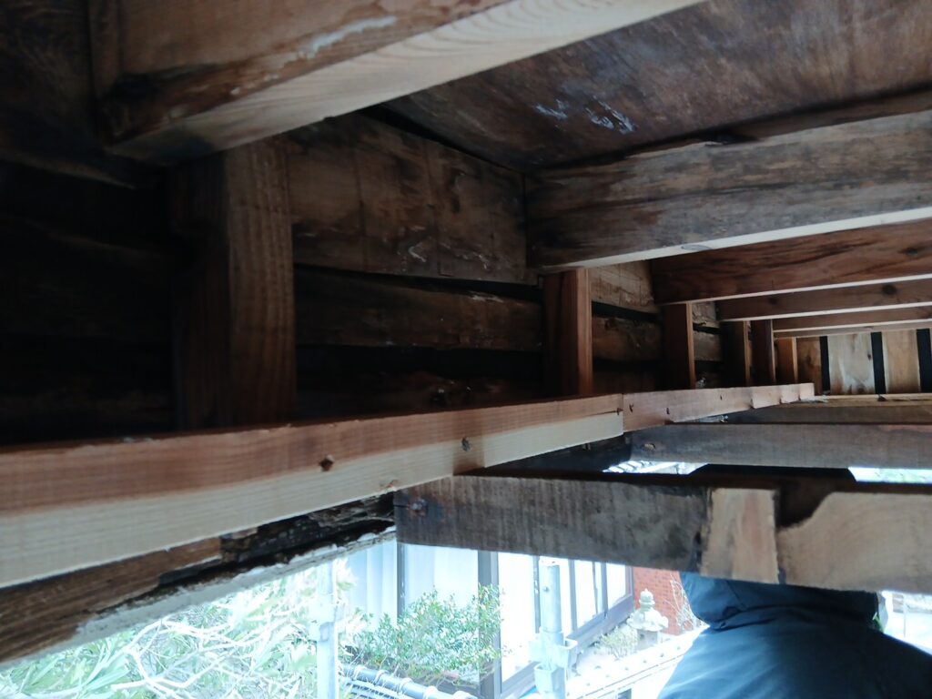 今回は強風により落ちてしまった軒天ボードの張替えをご依頼頂きました。ボードを固定していた釘・下地の木材が長年の雨水で腐食し、ボードが落下していました。